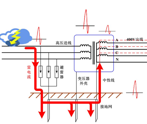 其四,前面说的是每栋房子都有地网,然后串联起来,而如果下面只有一栋房子有地网,或者只有其中某几栋有地网,这样连接起来,将会出现一个很大的问题,那就是地电位反击,上面这么宽的引雷的雷电流泄流下来,地网太小,来不及泄入到大地去,你们雷电流只能从下往上窜,将会对室内的电器设备进行毁灭性的破坏,甚至还会伤及人类。